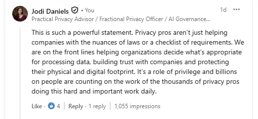 For anyone reading this newsletter wondering why you keep doing what may feel like climbing uphill, fighting for privacy resources or a seat at the table, asking tough questions, or pushing back on business leaders when they want to do something that might be questionable, know that your work is important. And Prince Harry thinks so too, as so well captured in Trevor Hughes’, CEO of IAPP, post.